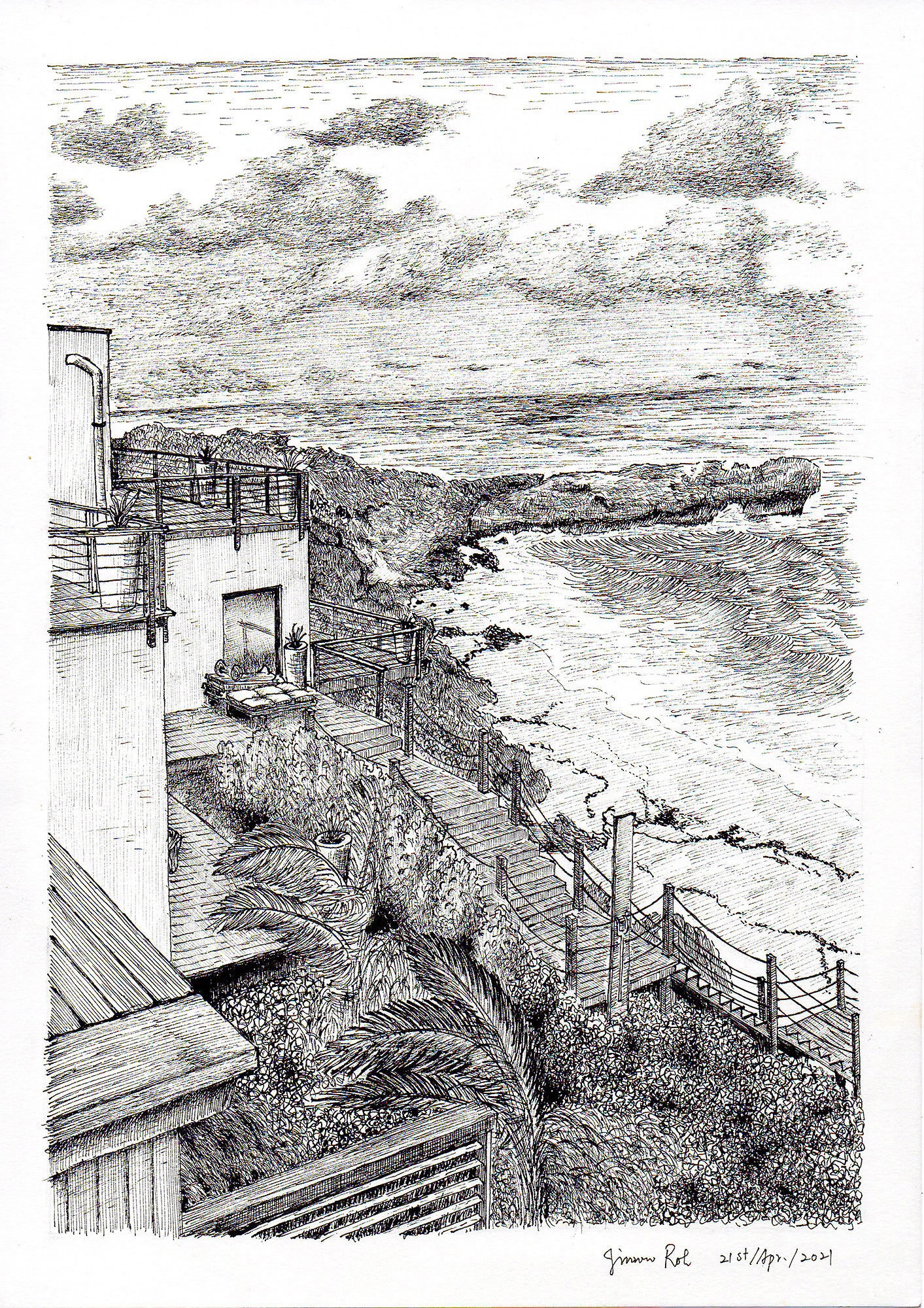저에게는 구름, 물, 바위, 풀 등이 가장 그리기 어려운데 이런 것들이 모두 들어가 있는 과제인지라 그리기가 많이 어려웠습니다. 그리다 보니 구름도 너무 짙어지고 나무, 풀 등도 마찬가지가 되어 전체적으로 좀 어두워진 것 같습니다.