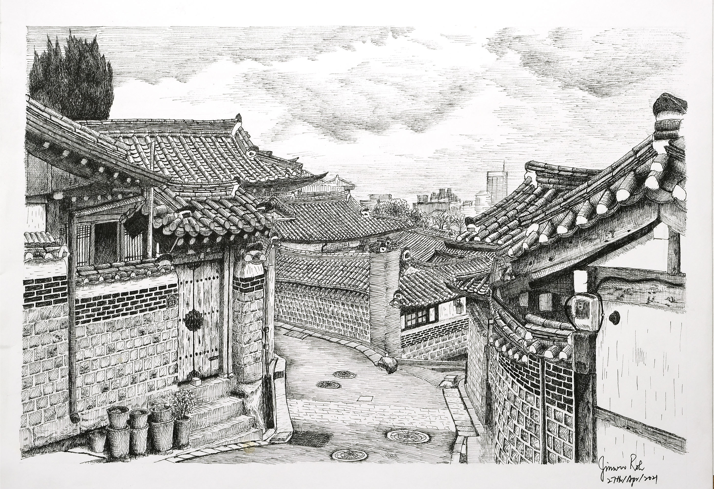 디테일 묘사를 좀 더 해 보고 싶어서 가는 펜 위주로 그렸습니다. 돌담의 질감을 표현하려고 시도했는데 질감은 제대로 표현 안되고 전체적으로 톤이 많이 어두워졌네요. 특히 가운데 뒷편의 담이 너무 짙어져서 원근감을 해치는 것 같네요...