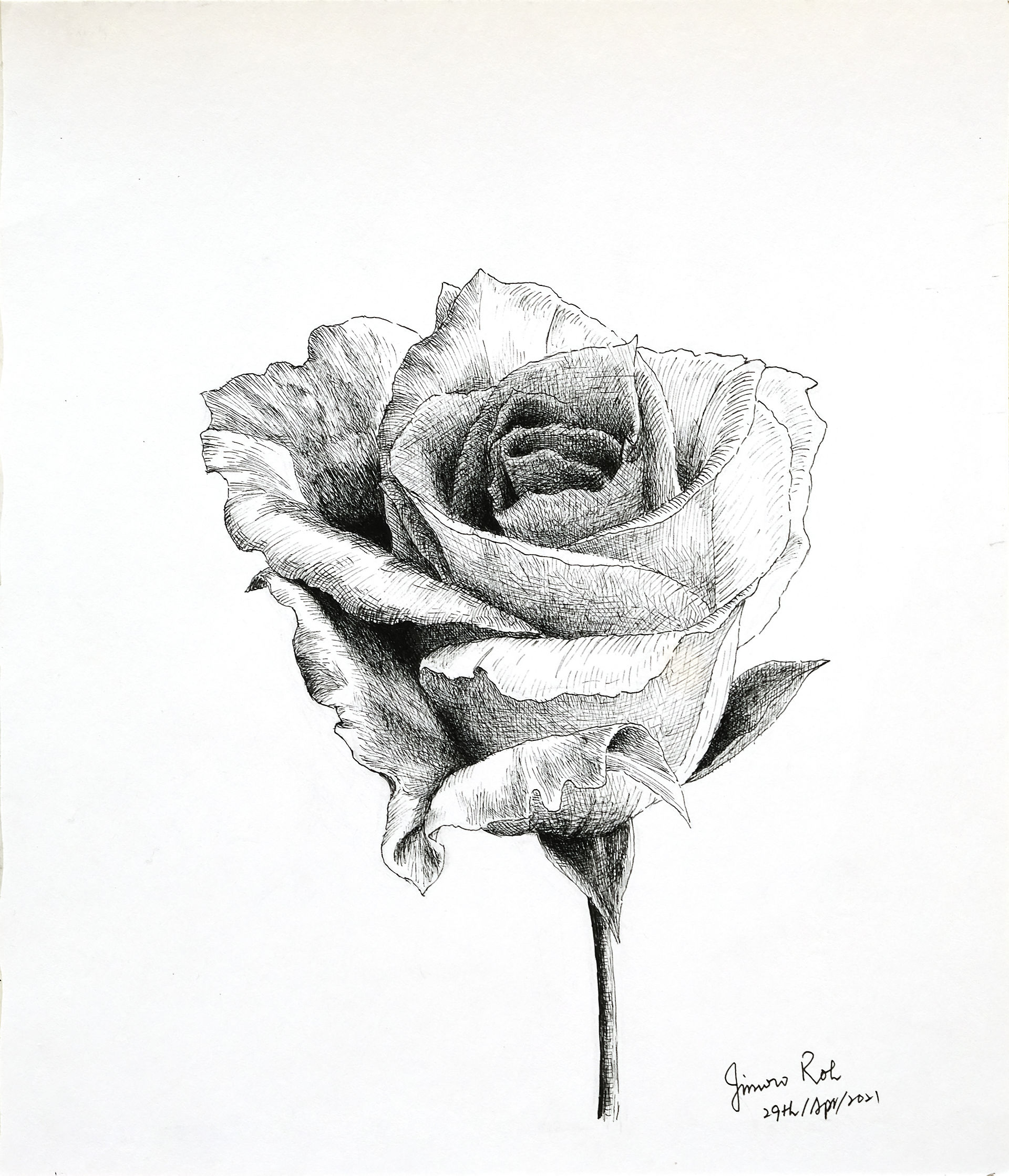 밝은 부분의 흰 장미의 질감을 살리는 표현에서 선을 아주 곱게 써야 하는 게 많이 어렵네요. 곱게 쓰려니 의도하는대로 잘 그어지지 않습니다. 명암의 미묘하고 다양하게 차이나는 걸 통일감 있게 그리는 것도 수정이 불가능한 펜화로는 좀 까다로운 과제인 것 같고요...