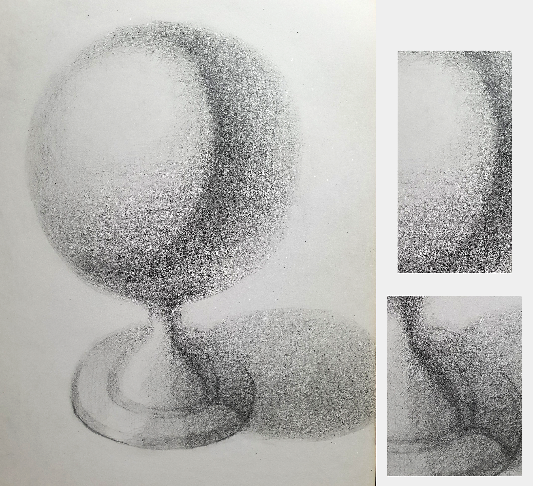 밑동은 지구본의 사진과 원기둥 소묘를 참고했습니다.계속 강의 노트를 번갈아보며 고쳐도 미완성 같고 어딘가 부자연스러운데 그게 뭔지 모르겠습니다. 특히 오른쪽에 잘라놓은 두 부분이요.처음이니까 선생님 그림을 우선 따라그렸어야 했는데, 제 나름대로 무턱대고 조금 변형을 가했던게 화근이었던 것 같습니다. 구가 빛을 받는 방향과 그림자 위치라든지요.그리고.. 간단하게라도 수정 또는 첨삭해주신 그림을 보고 싶습니다. 가능할까요?