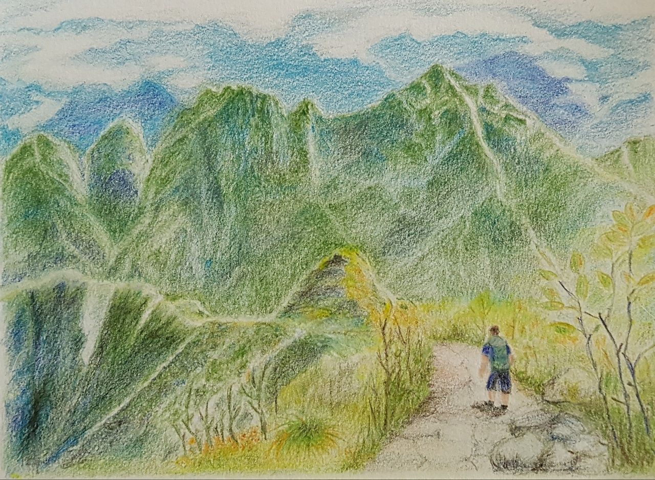 산의 굴곡도 많고 구름인지 산인지도 애매한 사진을, 선생님의 자세한 설명이 있었음에도 그리기가 정말 쉽지 않았어요. 고치고 지우고 다시 색칠하고... 몇 번이나 포기하려다가 색을 입히는 여러 가지 방법이라도 익히려고 끝까지 그리긴했는데 지금 보니 사진과는 많이 달라져있네요.좋은 배움을 얻게 된것에 감사합니다.