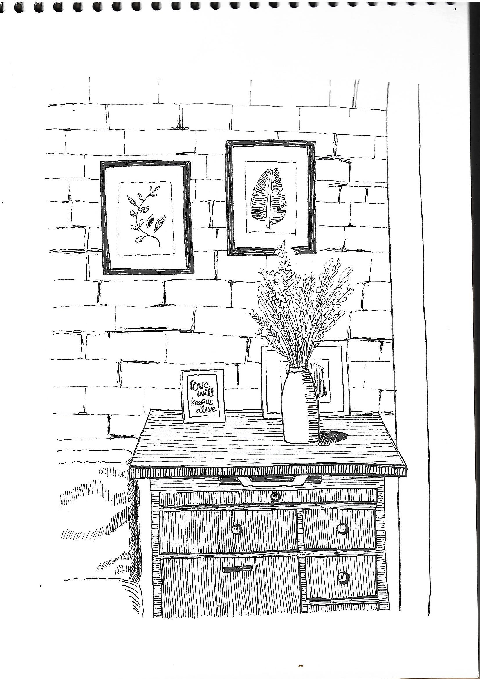 제가 그린 '서랍장과 수수 화분이 있는 벽면'이에요.