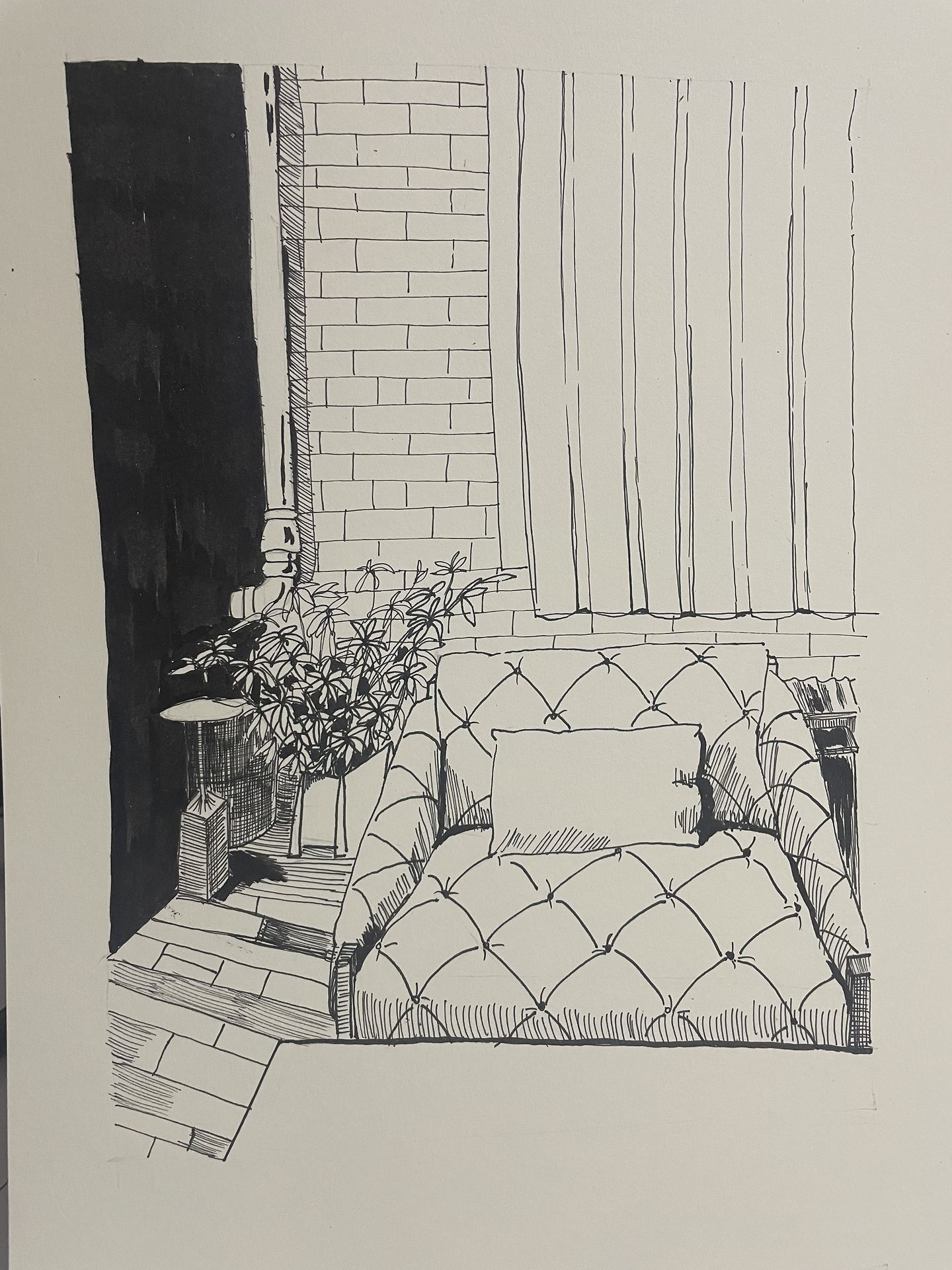 이번 그림은 아쉬운 부분이 많았던 거 같아요~ 벽돌도 너무 굵게 그려졌고 바닥도 삐뚤하네요 ㅠ 붓펜으로 칠하다가 오른쪽에 헛손질도…; 그래도 하다 보면 늘겠지 라는 생각으로 편안하게 그리고 있어용^^