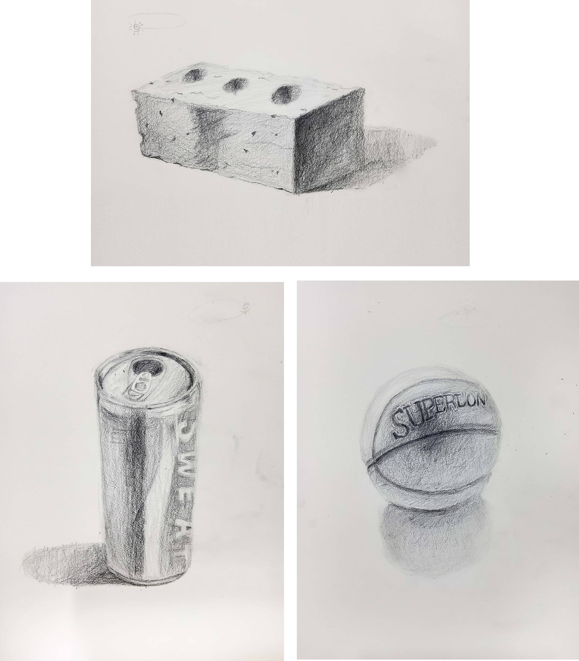 5주차 강의 실제 물체 그리기에 도전!의 벽돌, 포카리 캔, 농구공 그림 올려봅니다.
