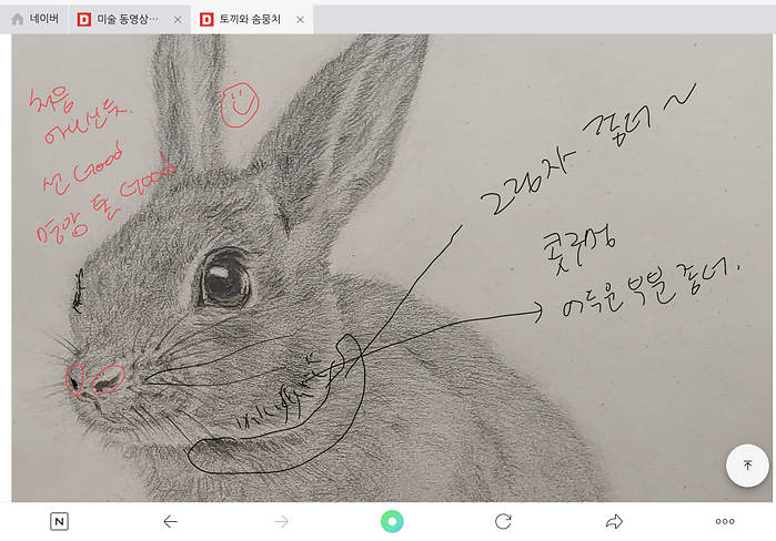 강의 수강신청 하자마자 토끼가 너무 그리고 싶어서 무작정 따라 그렸어요^^;; 왕초보라서 말씀하신 고대로 다 하지는 못했지만 완성은 해서 뿌듯해요~ 지금은 1강부터 차례대로 연습하면서 수강중입니다. 얼렁 중급, 고급까지 하고싶어요!! 쌤~~ 토끼 부족한 부분 말씀 좀 부탁드려요!! 그리고 강의 친절하게 해주셔서 감사합니다ㅎㅎ