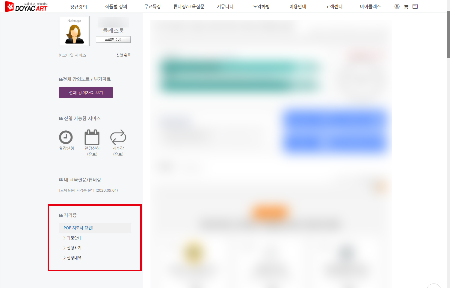 자격증 제출 작품 및 자세한 심사 기준, 필요 서류 등은 [마이클래스]에서 수강 중인 과목을 클릭하신 후 좌측 메뉴 중 [자격증]란의 [과정안내] 메뉴에서 확인하실 수 있습니다. (※ 현재는 PC버전에서만 해당 메뉴를 확인하실 수 있습니다.)